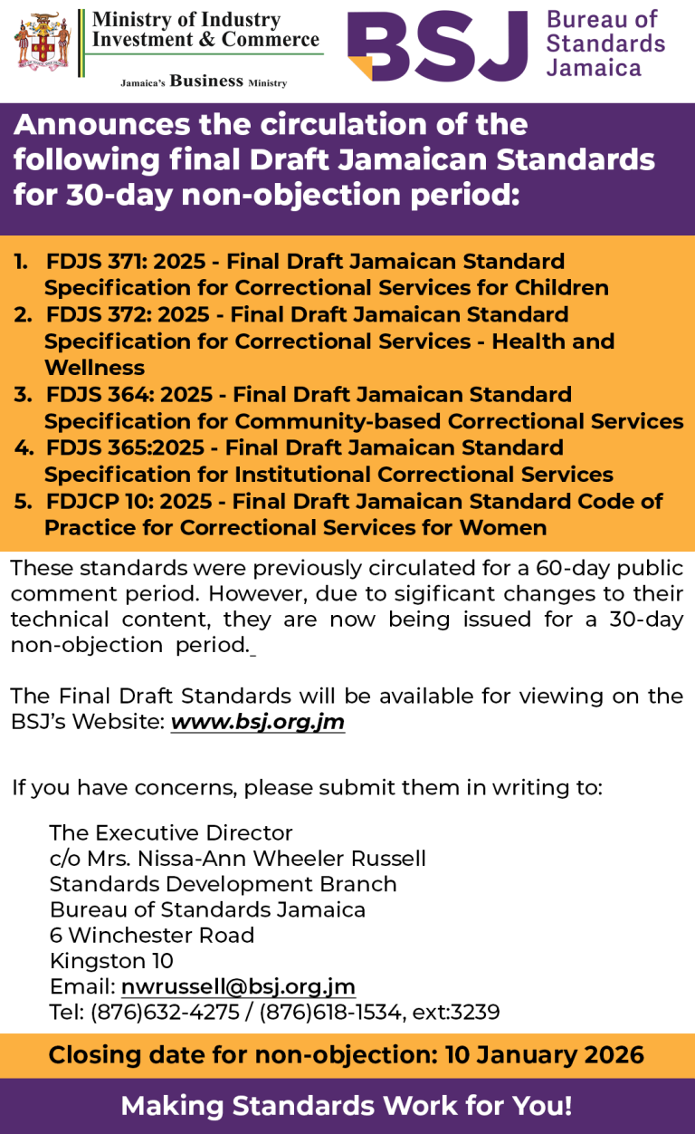Click here to view FDJS 365: 2025 – Final Draft Jamaican Standard Specification for Institutional Correctional Services
