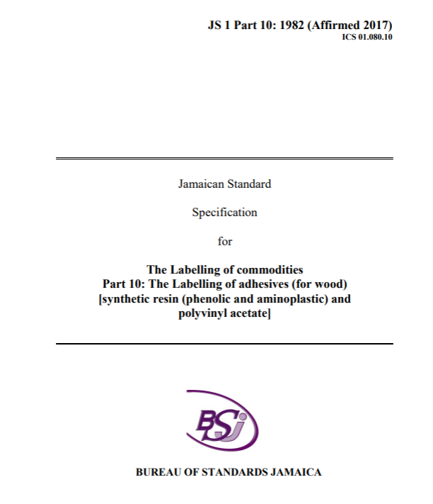 JS 1: Part 10: 1982 (2017) – The labelling of commodities. Part 10: The labelling of adhesives (for wood) [synthetic resin (phenolic and aminoplastic) and polyvinyl acetate]