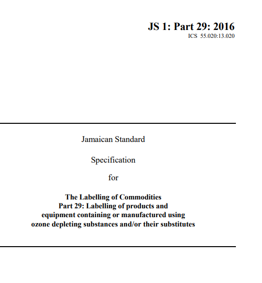 JS 1 Part 29: 2016 – The labelling of commodities. Part 29: The labelling of products and equipment containing or manufactured using ozone depleting substances and/or their substitutes.