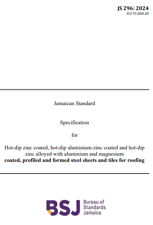 JS 296: 2024 – Hot-dip zinc coated, hot-dip aluminium-zinc coated and hot-dip zinc alloyed with aluminium and magnesium coated, profiled and formed steel sheets and tiles for roofing